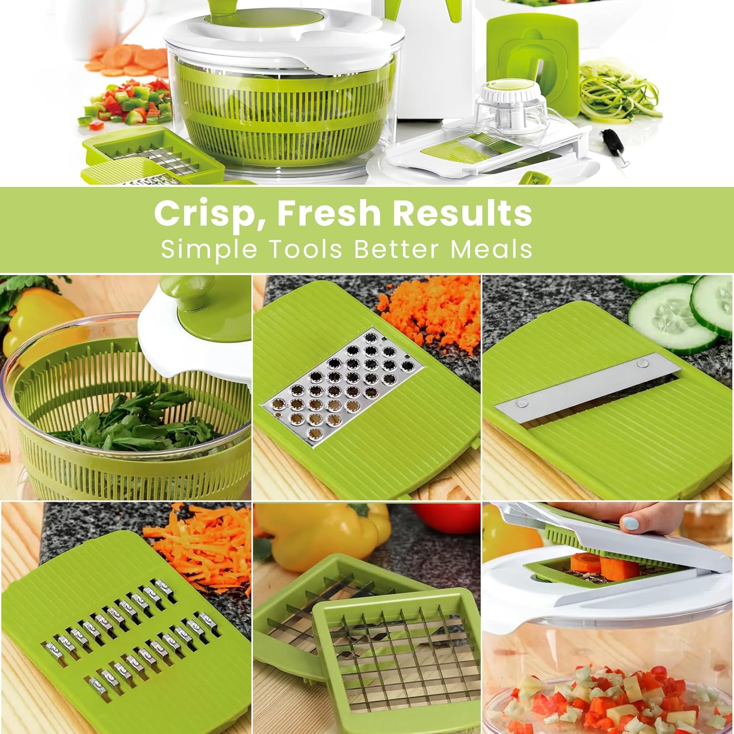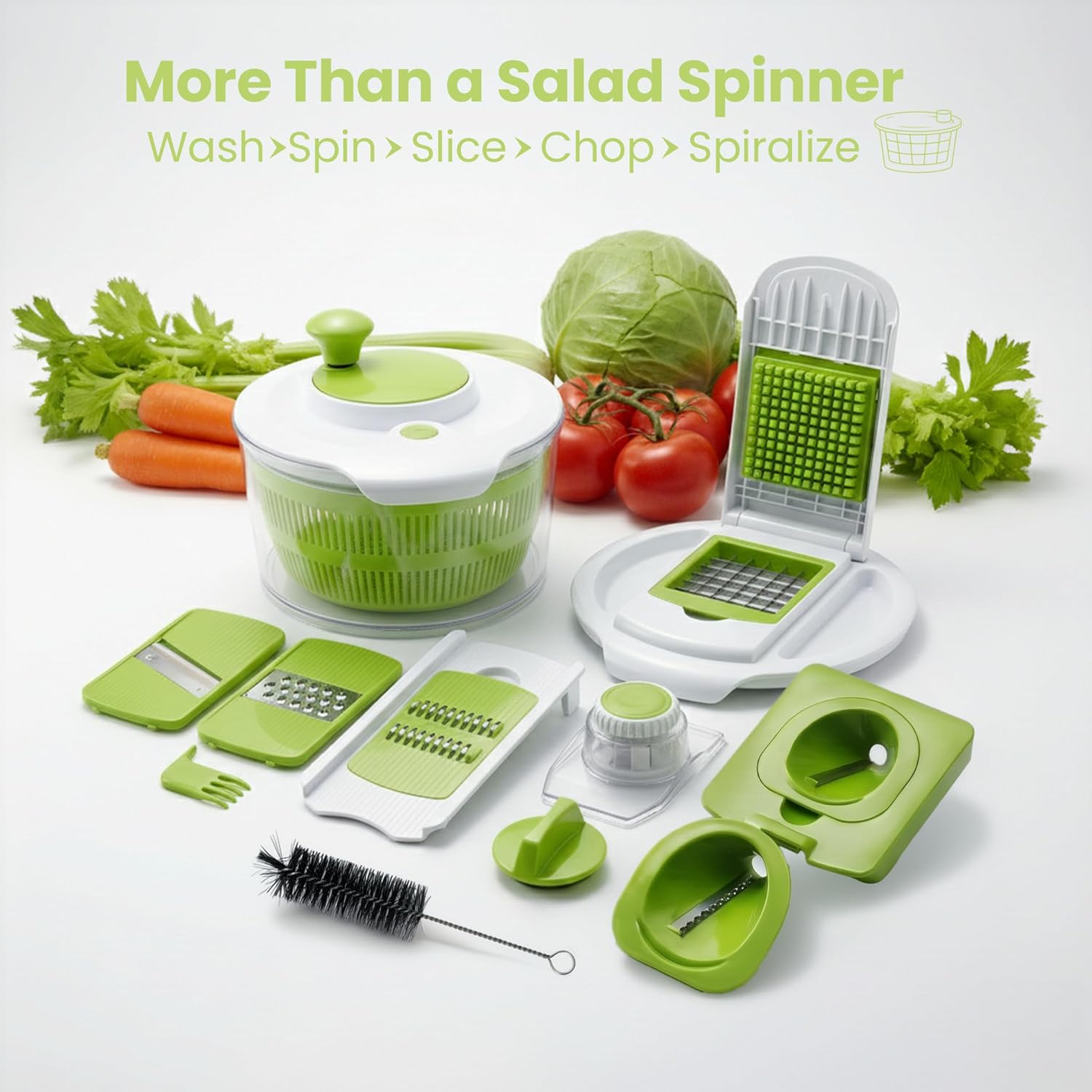 ๐ก ๐ฅ More Than Just a Salad Spinner.Most Large Salad Spinners can Simply Wash and Dry Lettuce. This 7-in-1 Chopper Vegetable Cutter is a Full Meal Prep Solution That Includes a Lettuce Dryer Spinner, Vegetable Slicer, Mandoline Chopper, Grater, Julienne Cutter, Ribbon Maker, and Spiralizer all in One Compact Design.๐น Large-capacity Salad Spinner Wash And Spin a Whole Head of Lettuce, Kale, Spinach, or Herbs in Seconds. Competitor Comparison: Compared to Basic Spinners, Which Have Smaller Bowls and Cannot Accommodate Family Servings.๐น Interchangeable Stainless Steel Blades Manual Salad Spinner with Slicer Use for Slicing Cucumbers, Grating Carrots, Julienne Zucchini, Shredding Cabbage, or Creating Thin Vegetable Ribbons.๐น Spiralizer Attachment It Produces Spiralized Zucchini Noodles, Curly Fries, and Ornamental Veggie Ribbons.๐น Vegetable Chopper & Cutting Gadgets It Rapidly and Uniformly Chops Onions, Peppers, Garlic, and Fruit. Includes a Safety Hand Guard. Competitors use Only Dry Lettuce. Our Food Prep Tool Chops, Cuts, and Prepares.๐น Non-slip Silicone Base The Rubber Grip Ensures the Spinner Remains Firm During Quick Spinning or Slicing.๐น BPA-Free and Dishwasher Safe Salad Spinner Dishwasher Safe Features Food-grade, Sturdy Polycarbonate and Stainless Steel for Everyday Use.๐ฏ Why this is The Smarter Choice Saves Time: Spin, Chop, Slice, and Spiralize. Saves Space: Replaces Multiple Kitchen Gadgets. Saves Money: No Need to Buy Separate Slicers, Spiralizers, or Choppers. Perfect Gift: A Must-have for Families, Health-conscious Cooks, or Wedding Registries.๐ Upgrade your Kitchen Today!Don't Settle with Spinners that do Half the Work. The 7-in-1 Salad Cleaner Bowl Spinner & Vegetable Prep System is the Complete Answer for Fresh, Healthful Meals. From Fresh Lettuce to Spiralized Vegetarian Noodles, it has everything you need in one Robust, Space-saving Design.