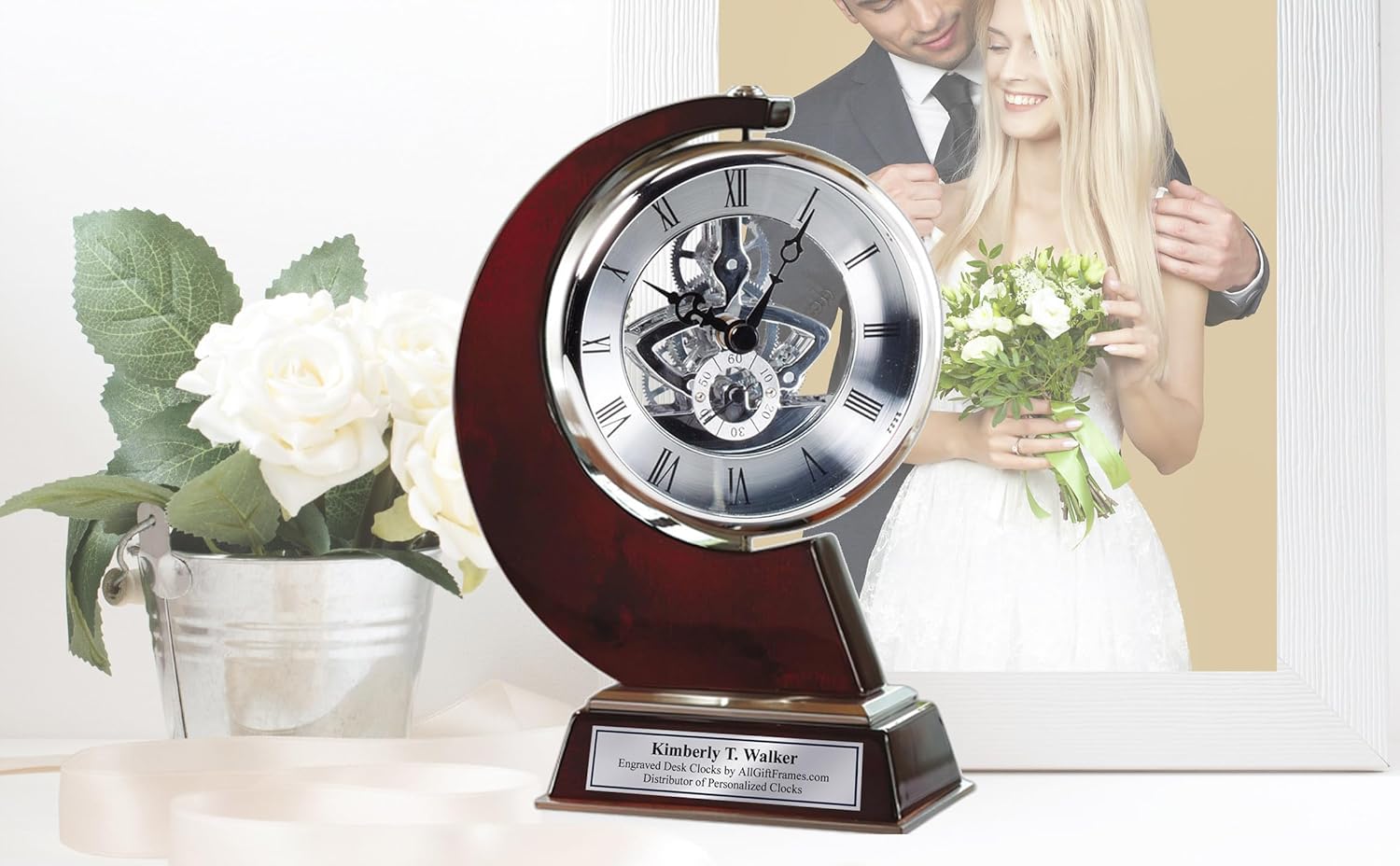 Da Vinci Table Desk Clock Which Rotates 360 Degrees with Silver Engraving Plate. Complimentary ENGRAVING Silver Engraving Plate. Complimentary Inspirational Quotes Gold Keychain Gift by AllGiftFrames Framing Achievement Inc. Clock size is 10 x 6 5/8 Custom Engraving Plate fits 1 - 3 lines. Unique Retirement Gift, Wedding, Employee Recognition Award and Anniversary Presents. This dynamic metal gear clock is encased in brush silver aluminum and mounted on a wooden base with brush silver accents. The stunning focal point of this magnificent timepiece is the glistening chrome gear movements in the clock dial that is suspended on a polished sleek curvature wood design. The Legacy clock rotates 360 degrees in an intriguing manner and has a modern look for a timeless appeal. Experience the true joy of employee recognition requires taking a moment to reflect and appreciate your coworker or friend. Add a touch of elegance by recognizing your friend and adding a personalized engraving plate.