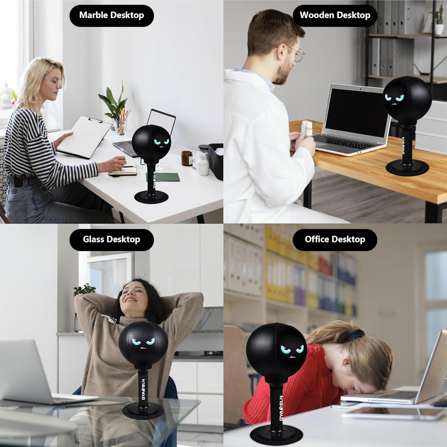 Tired of the same old boring desk toys? Craving a fun and engaging way to relieve stress and boost your focus during work breaks? Look no further than the desktop punching bag , your personal ringside ticket to fitness and fun!Why choose BYAOSUN Desktop Boxing?FeaturesOur desktop boxing is an ideal stress relief toy for office and home environments.Our desktop punching bags are made high quality materials to make sure they last.Our desktop Punching bag Simple and easy to install,is designed with strong suction cups.Our desktop boxing set is smartly designed and comes with a gift box package, Comes with pump,suitable as a gift for friends, colleagues or family.We will provide customers with high-quality desktop boxing . If you have any dissatisfaction with our fun punch bag, please do not hesitate to contact us.Places to use: smooth desktop, office table, marble, glass, smooth dining tablePackage Contents1 x Stress Punching Bag1 x High Performance Spring1 x Power Suction Cup1 x PumpCaution:As this product adopts a more flexible adsorption function rather than a fixed function, it is recommended to press the bottom again before each use, so that it can be more adsorbed to the desktop before impact.Color:Black
