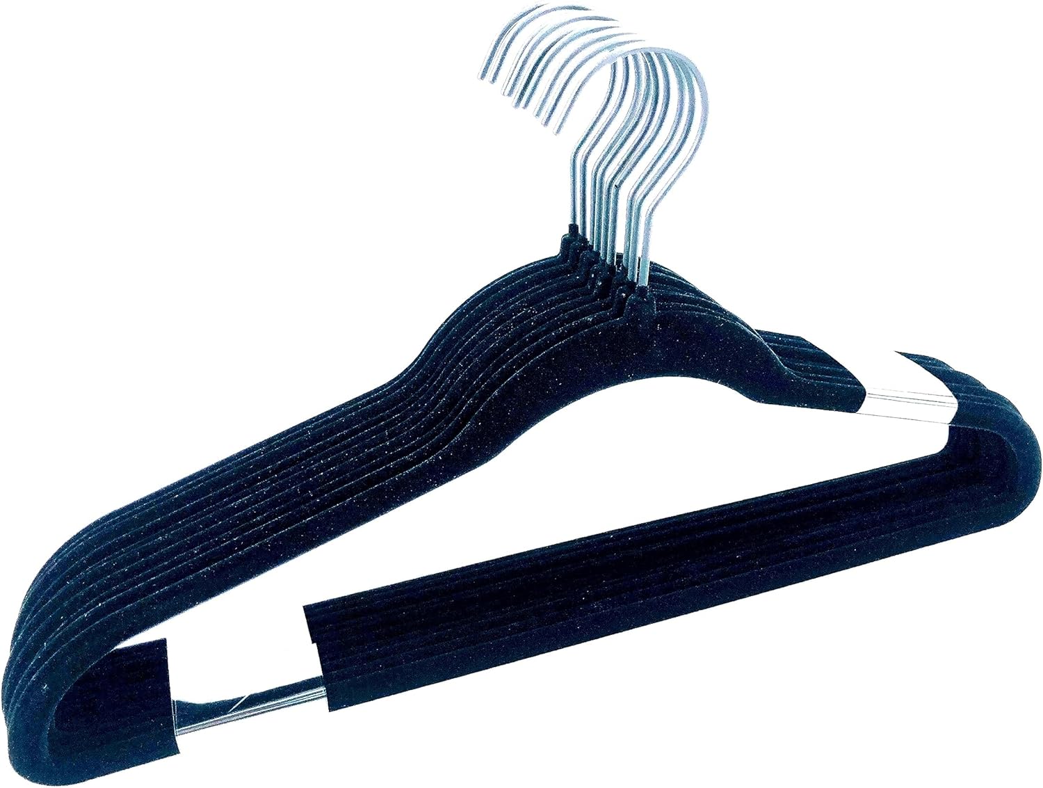 Simple and elegent design. Gentle, rich velvety surface - feeling soft with anti-slip function. Extra long 44.5cm, better hanging effect on big size garment. Lightweight, slim, space saving, not easy to break, suitable for hanging shirts, sweaters, dresses. The bar can hang trousers together. 360 degree rotatable hook, suitable for different hanger environment. 10pcs/pack. One pcs dimensions (approx.) 44.5 X 0.6 X 24.5 cm.