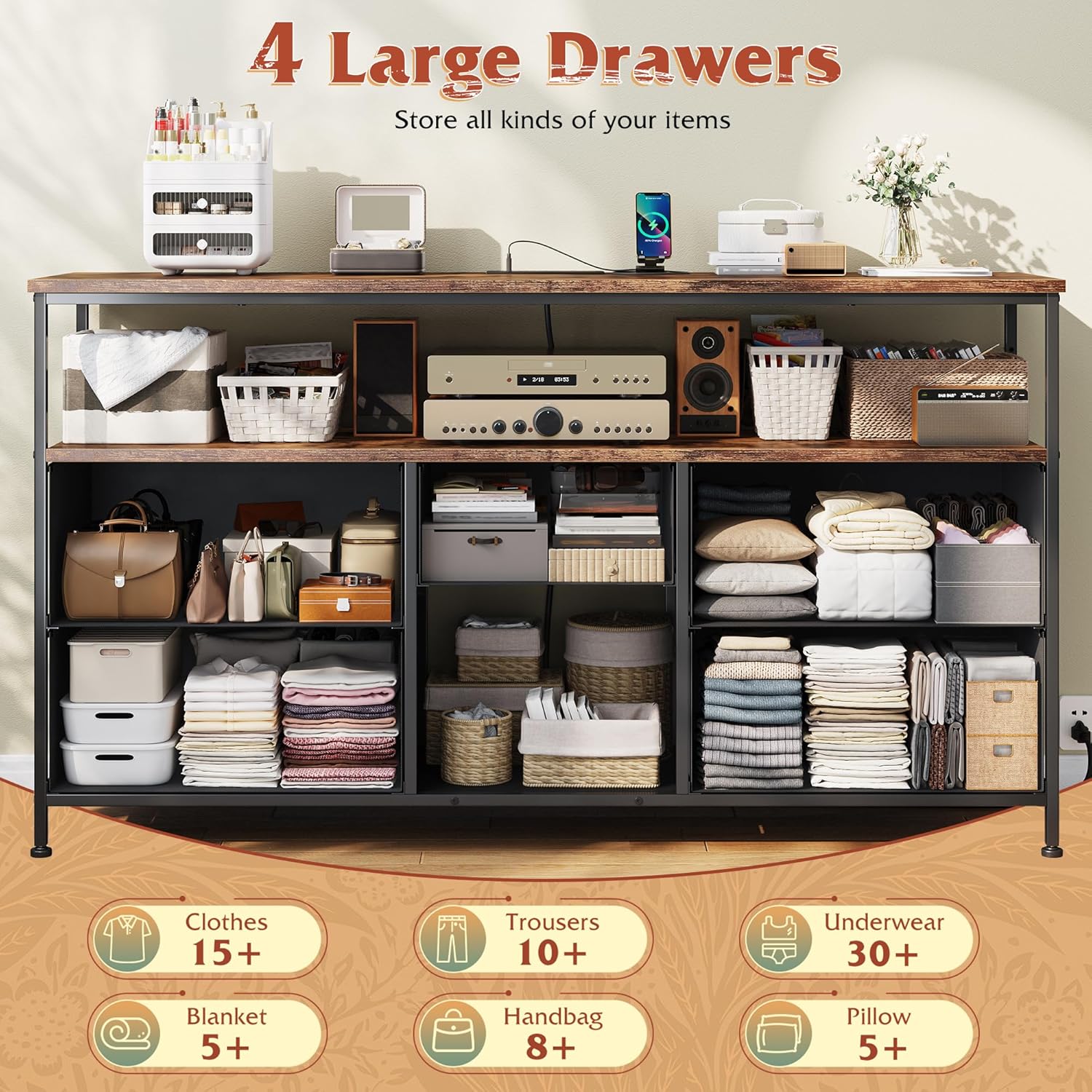 | Material Type | Fabric Drawers, Metal Frame, Wood Top |