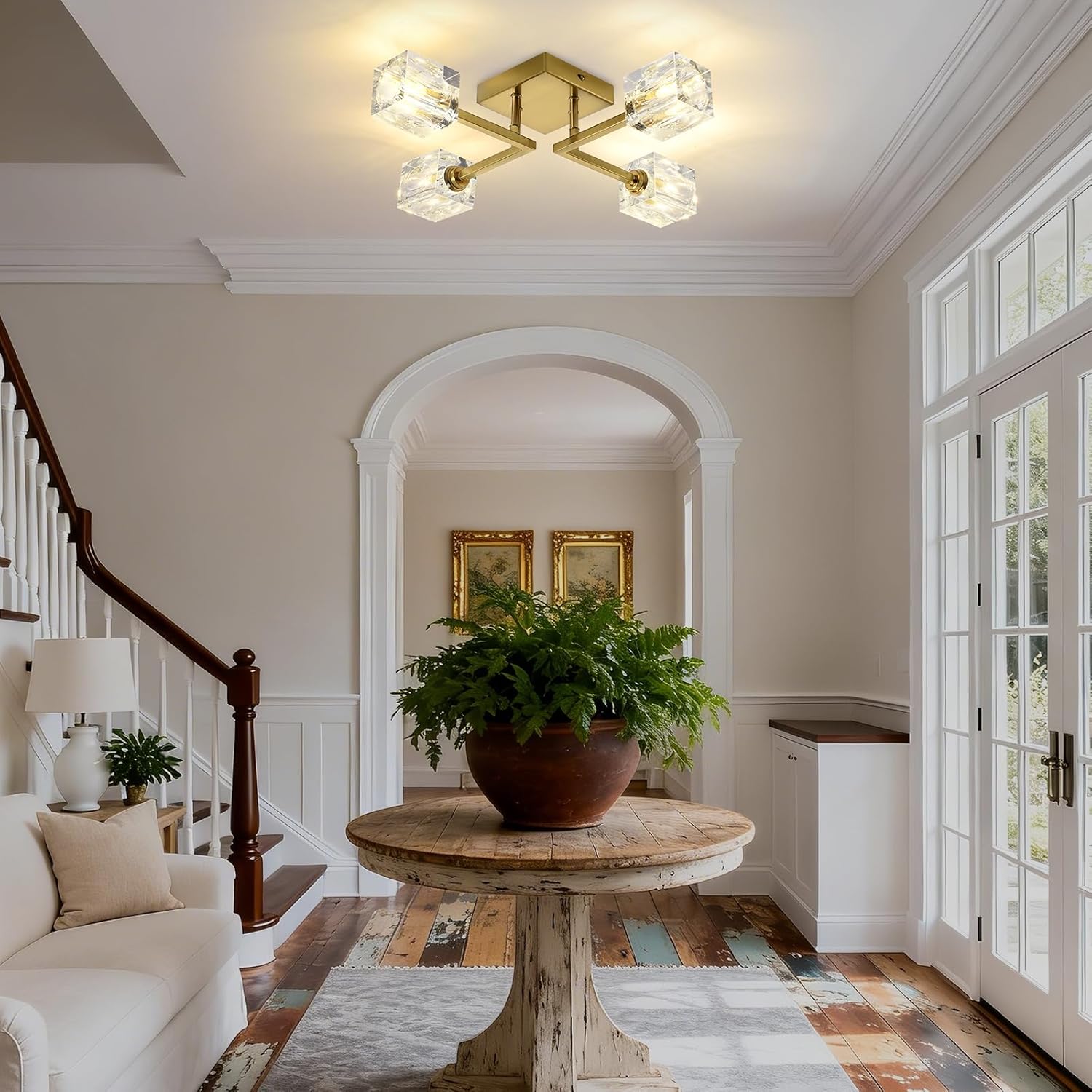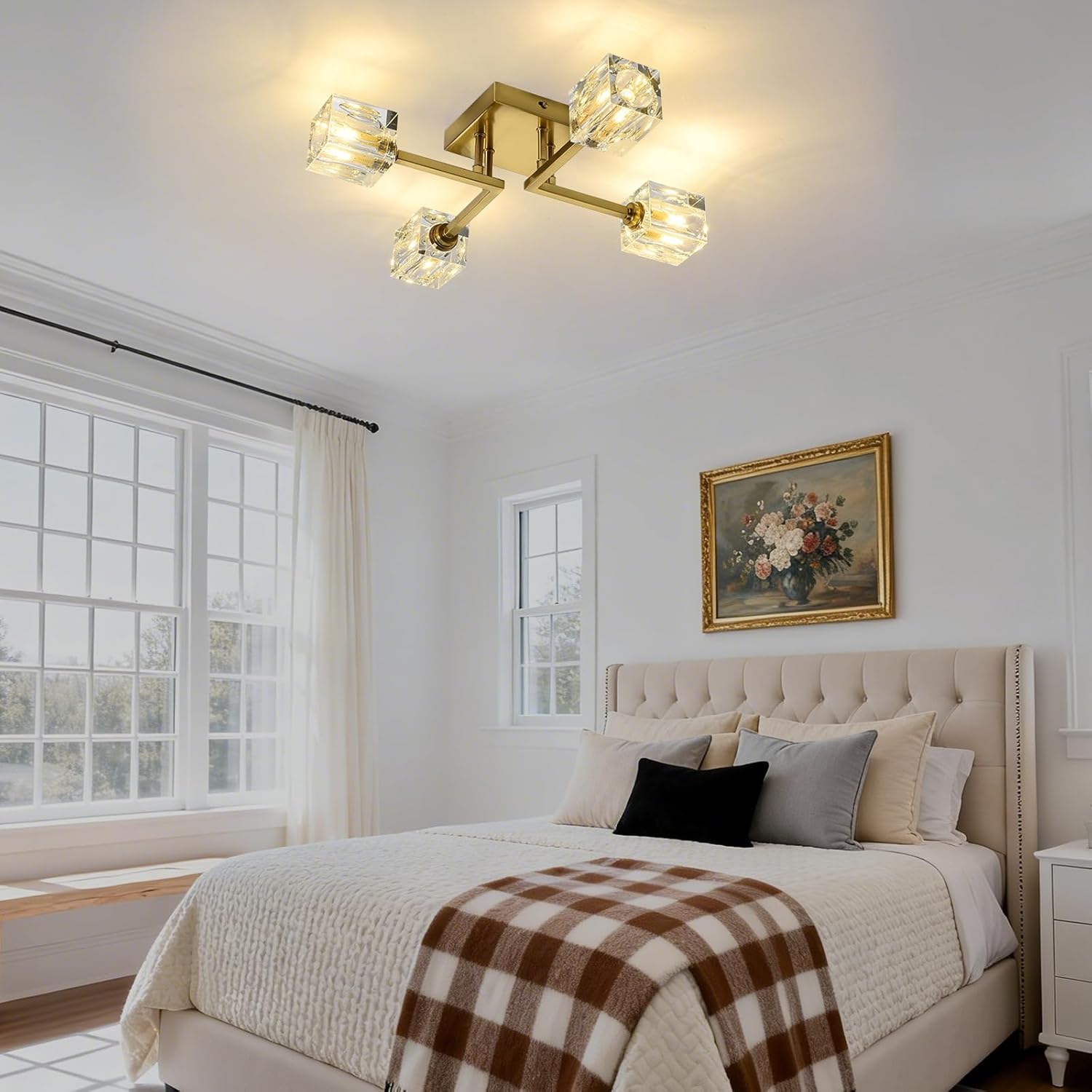 Gold Sputnik Ceiling Light Fixture, 4-Lights Modern Semi Flush Mount Chandelier, Glass Ceiling Lights For Living Room Bedroom Dining Room Hallway Kitchen Entryway