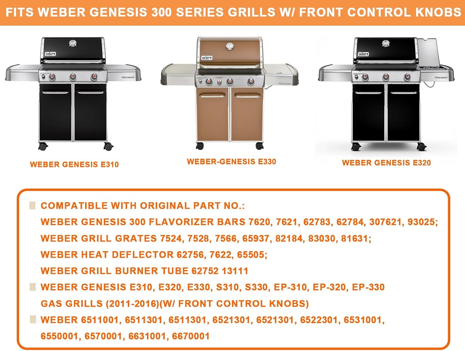 For weber genesis parts. Fit Weber Genesis 300 series gas grills (w/ Front Control Knobs), for weber Genesis E310, E320, E330, S310, S330, EP-310, EP-320, EP-330 gas grills (2011-2016). For weber genesis replacement parts. Fit weber Models for Weber 6511001, 6511301, 6511301, 6521301, 6521301, 6522301, 6531001, 6550001, 6570001, 6631001, 6670001.