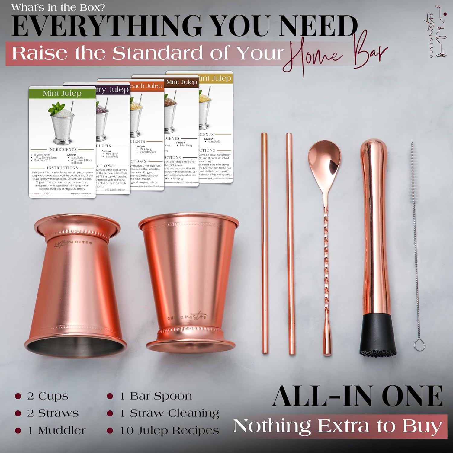 | Included Components | 2 Julep Cups, 2 Straws, 1 Muddler, 1 Stirring Spoon, 1 Straw Cleaning Brush, 10 Julep Recipes |