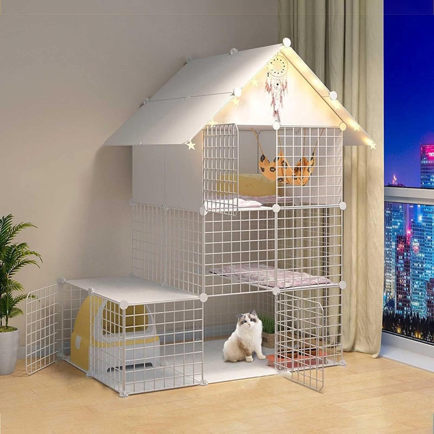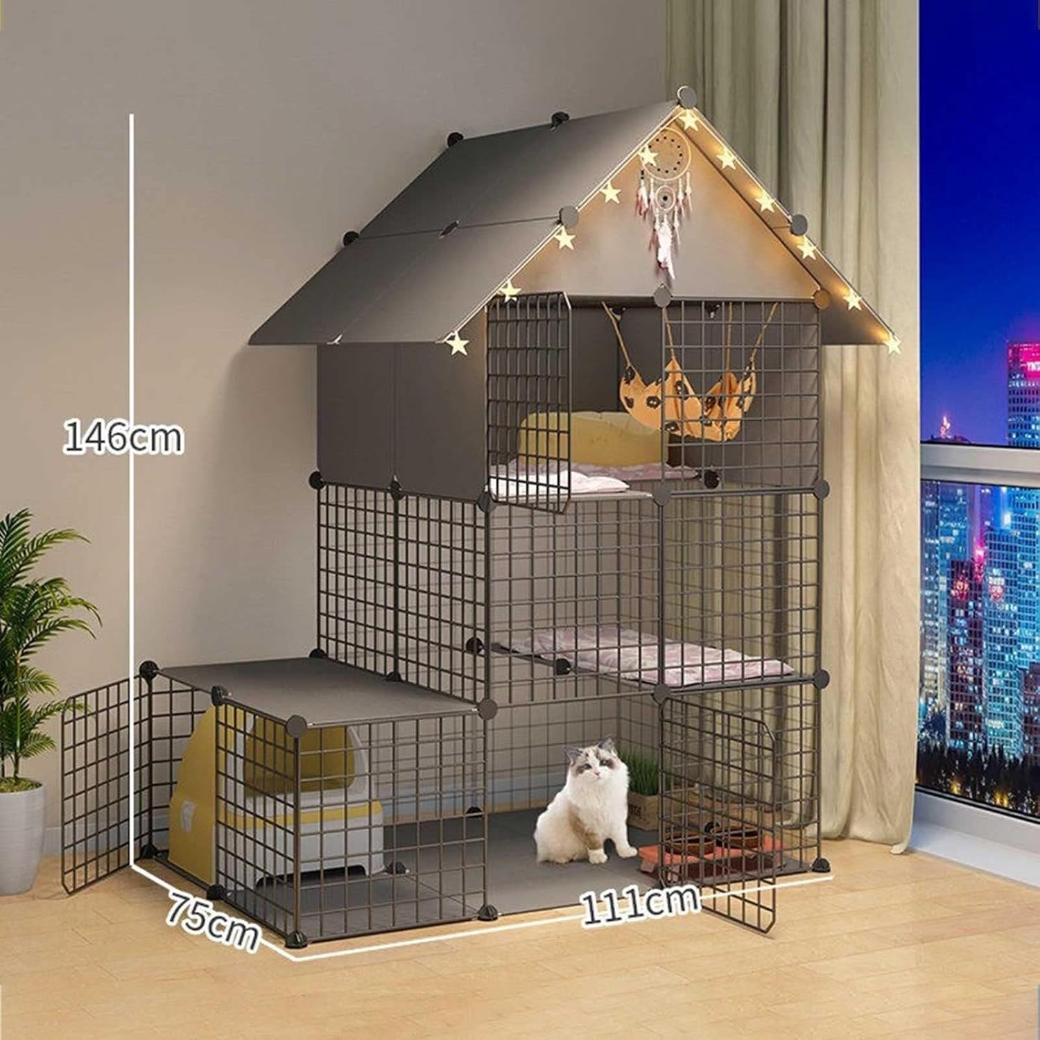 This Indoor Large Cat Cage is the perfect multi-functional pet enclosure designed to keep your cats and small animals safe, happy, and active. Featuring multiple spacious layers, your pets can jump, climb, and explore Freely, reducing conflicts and boredom.The cage includes a built-in storage shelf to organize pet essentials, helping you maintain a clean and clutter-Free space. Constructed from sturdy metal with reinforced buckles and cable ties, it ensures durability and prevents pets from escaping.Designed for easy, tool-Free assembly within 15–30 minutes, this cage also offers front doors with safety latches for effortless access and cleaning. Its versatile design is ideal for cats, kittens, guinea pigs, ferrets, rabbits, and even small puppies.Product name: DIY cat cage Size: as the picture showsColor: Black , WhiteMaterial: Metal, PP resinAccessories: installation tool, climb the ladderSuitable: cats, guinea pigs and ferrets , Rabbits and other small petsPACKAGE INCLUDED: 1x cat cage1x installation tool1x climb the ladderNote: The accessories of this product are for reference only, the Free accessories will be subject to the actual product received, thank you for your understanding
