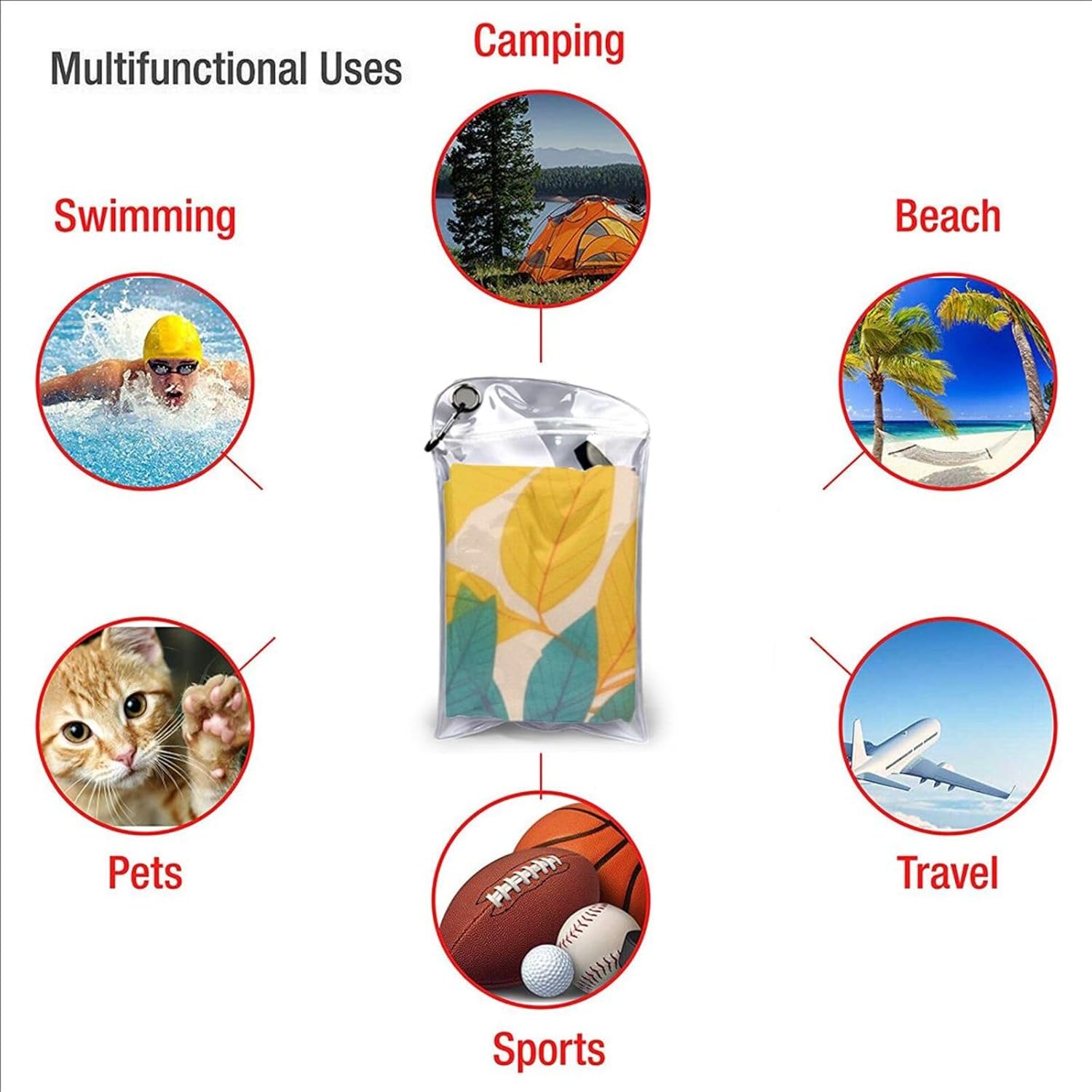 designMulticolor leaves compact towel for camping are designed with one-sided printing. The towels are equipped with special packaging bags and carabiners, which are convenient for packaging and hanging, and can be hung anywhere to dry quicklymaterialcompact towels for swimming is made of microfiber, which is more absorbent than standard towels, dries quickly, is lightweight, and small enough to easily fit the towel into a gym bag or backpackscene cotton towel for beach carabiner on the bag, can be attached or packed into your bag, the beach towel can also be used as a sports towel, travel towel, yoga towel or used as a beach, bathing, swimming pool, swimming, boating, sunbathing, mats for spa, sauna, water park, climbing, fitness, yoga, travel, camping, hiking, picnic, travel, outdoor and sports, etccomponentbeach blanket for swimming have buckle webbing, easy to hang and air dry, pvc packaging bag, equipped with a carabiner, easy to store and carrywashinglightweight towel for swimming machine washable, wash before first use, just hand wash or machine wash, air dry