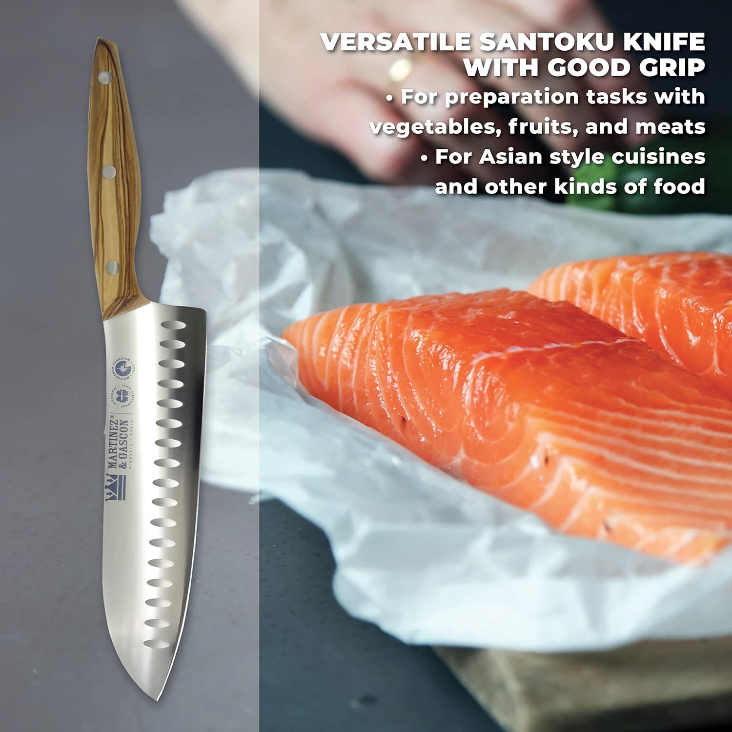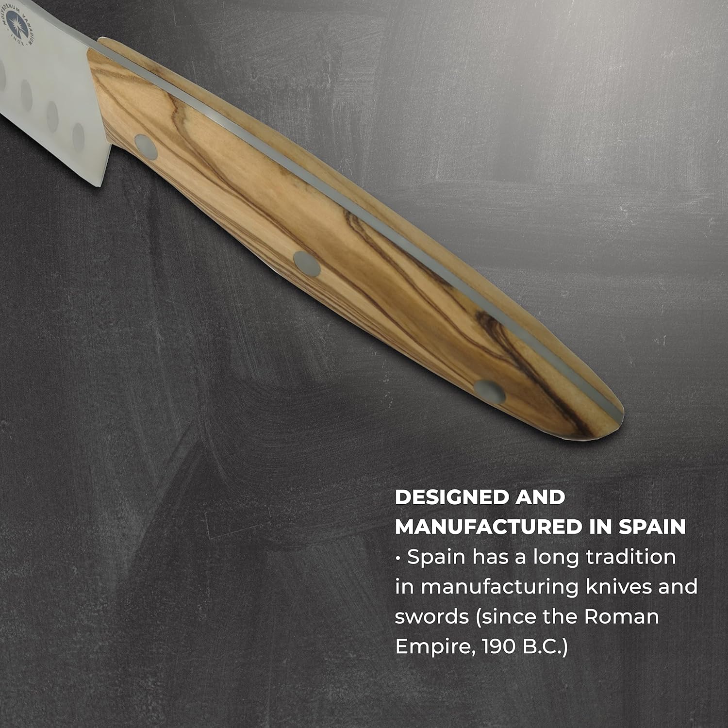 Classical Santoku knife with olive wood handle. The knife is 13" total length, full tang, with a sharp 7-3/4" smooth edge blade. The handle is triple-riveted and made of Spanish olive wood, which comes from plantations in Andalusia. This knife has a beautiful contemporary design that will be appreciated by cook lovers that want to reflect their environmentally conscious preferences in their lifestyle. Gift box included.