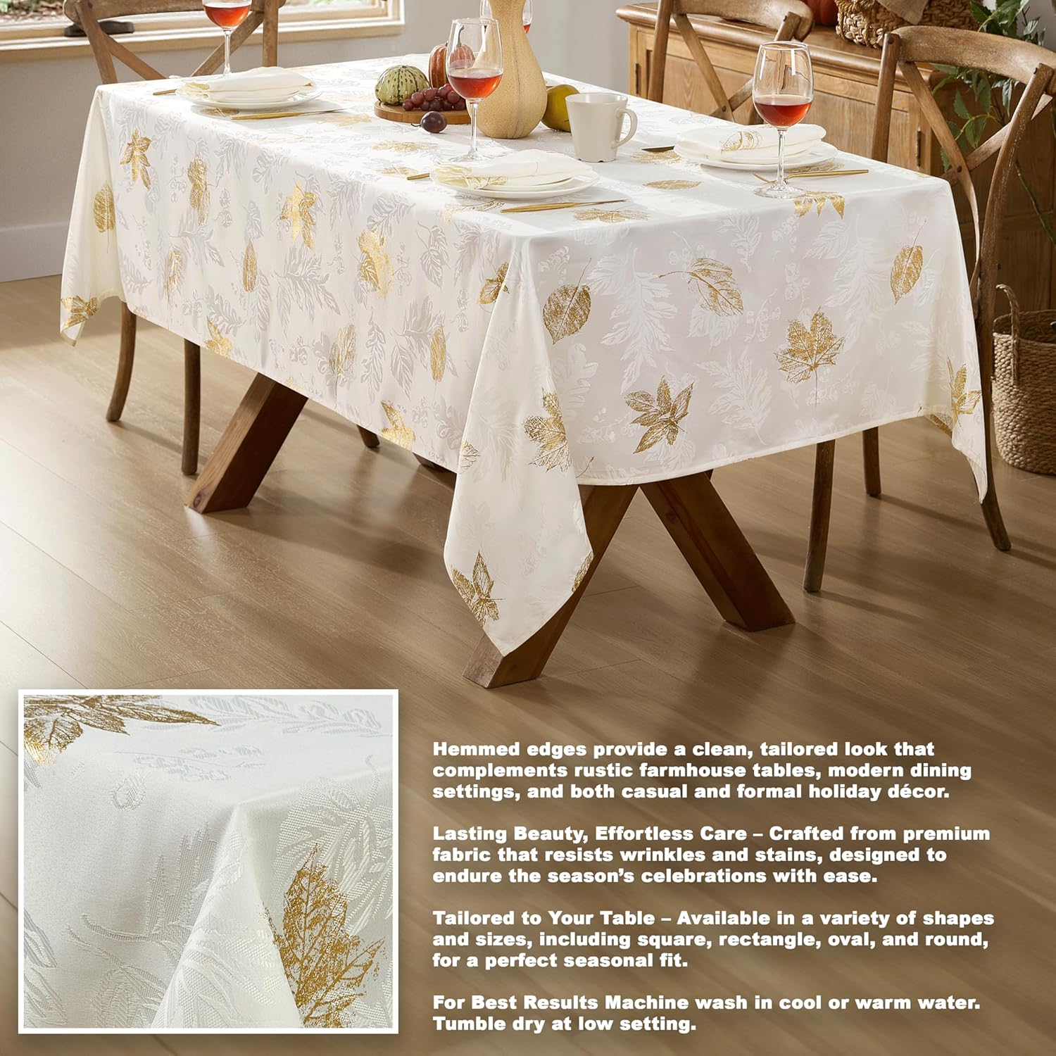 The Ivory and Gold Leaf Metallic Damask Fabric Tablecloth features a traditional allover medium format damask and a overprinted metallic leaves design with a subtle visual texture. Great for use with adults and children at home or in commercial settings. Perfect for decorating for dinner parties, weddings, banquets, holiday entertaining and everyday use. 100% polyester construction is easy care and soil resistant. Machine Wash Cold on Gentle Cycle. Tumble Dry Low. Requires little or no ironing. Finished with sewn merrowed hems. Easy to fold and store when not in use. The Ivory and Gold Leaf Metallic Damask Fabric Tablecloths are available in selection of 8 sizes and matching napkins. Sizes available are: 52 Square, 52 x 70 Oblong 60 x 84 Oblong, 60 x 84 Oval, 60 x 102 Oblong, 60 x 102 Oval, 60 x 120 Oblong, 60 x 120 Oval, 60 x 144 Oblong, 70 Round. Matching Napkins are sold in sets of 4.