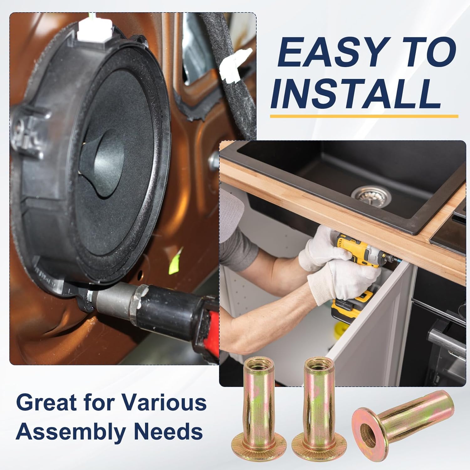 Perfect for automotive, furniture assembly, industry, construction, electrical appliances, and equipment, these rivet nuts are installed quickly and cleanly, saving time and labor costs.SpecificationMaterial: Carbon SteelFinish: Color Zinc PlatedThread Size: 1/4-20Length: 27.5mm / 1.08"Head Diameter: 16mm / 0.63"Rod Diameter(Drill Hole Size): 9mm / 0.35"Length after Riveting: 12.5mm / 0.49"Rivet Plate Thickness: 0.5-7mm / 0.02"-0.28"Packing List: 12 Pcs x Rivet NutsAdvantageRivet nuts are made of carbon steel, color zinc plated surface treatment, high hardness, oxidation resistance, rust resistance and corrosion resistance, and durability. The multi-grip, pre-bulbed, flat-head design of the rivet nuts ensures a stable performance and stronger fixation.InstructionEasy to use: Drill a hole according to the size, and insert the jack nut with a tool to expand and bind firmly to the substrate. The expanded nut head securely fastens to the plate with good load-bearing capacity.NOTE: Features an extended grip range to meet different material thicknesses, such as sheet metal or non-metallic materials, plastics, and wood, making them great for various assembly needs.