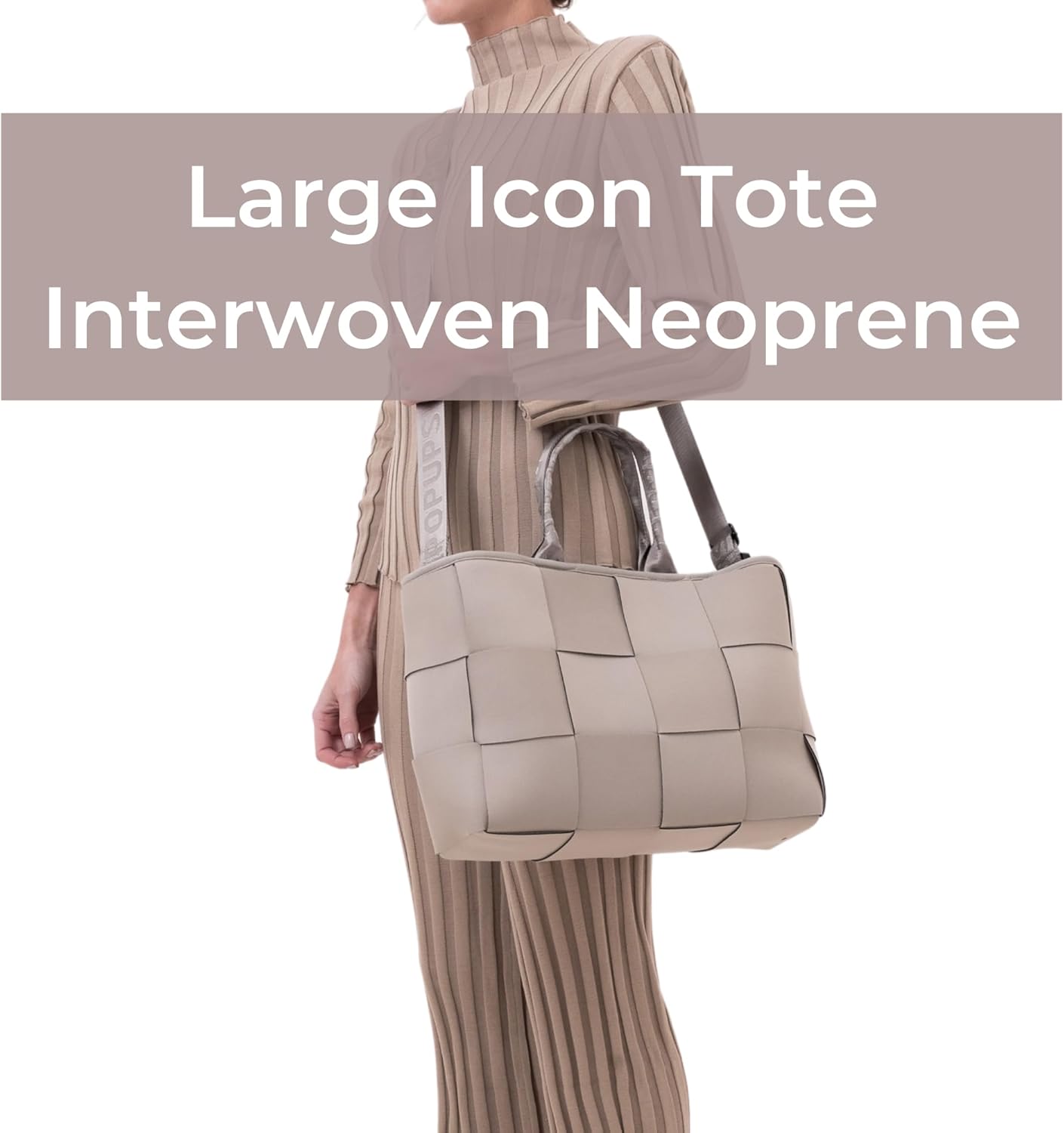 • The Icon tote bag - The POPUPS sophisticated interwoven neoprene tote is made with 100% luxe perforated neoprene fabric: lightweight, water-resistant, breathable, and durable. This shoulder bag comes with a detachable crossbody strap for a hands-free tote.