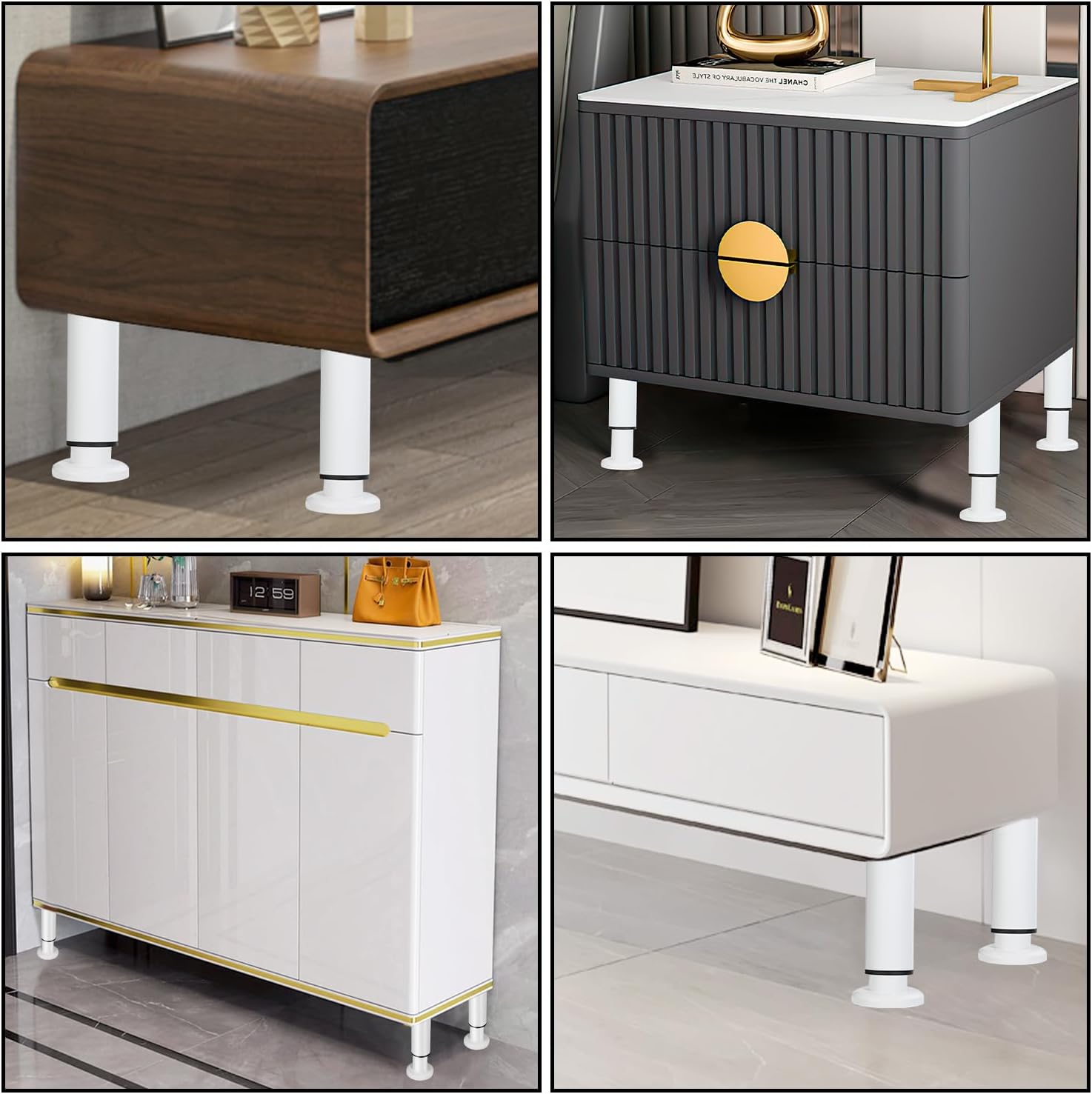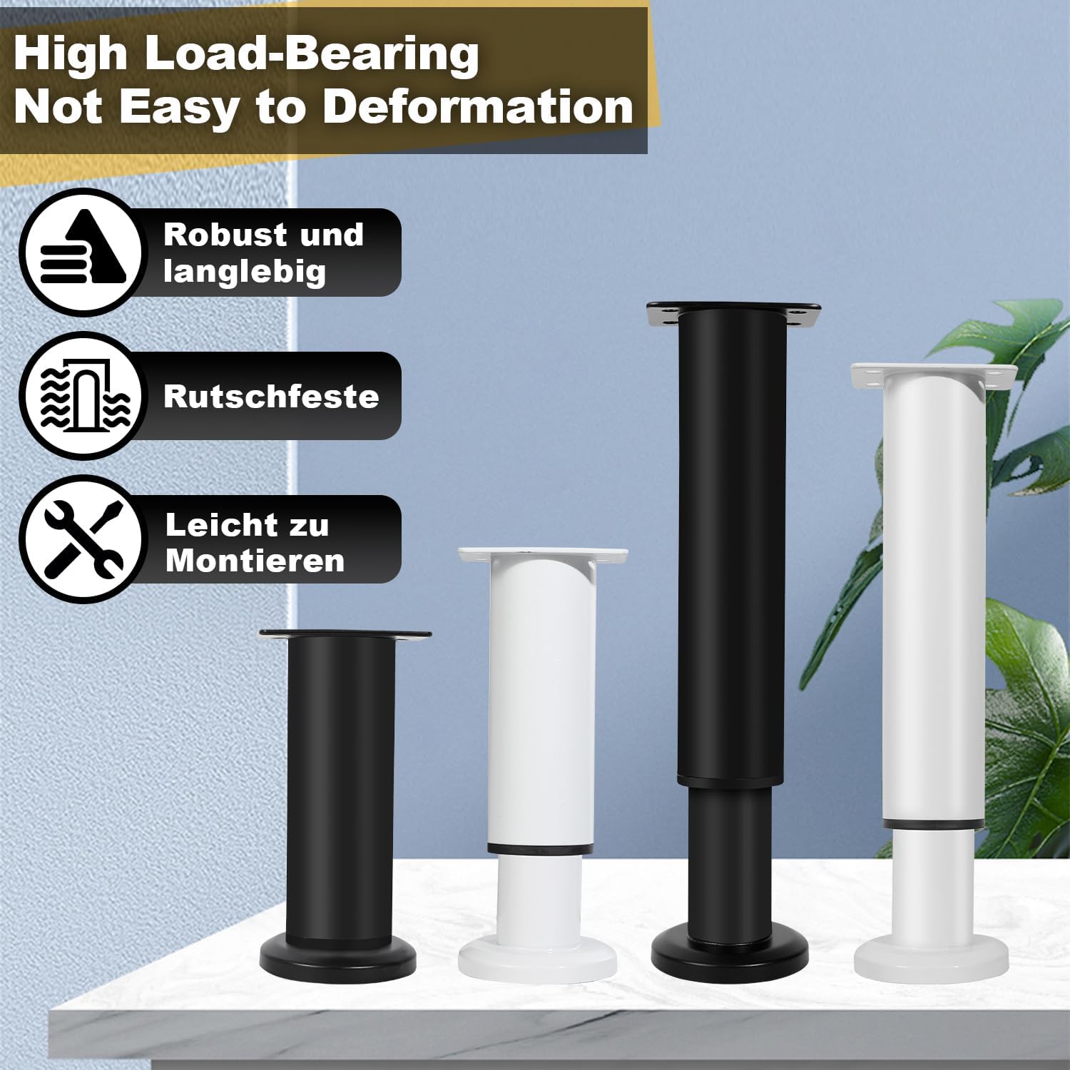 Furniture feet a combination of functional and aesthetic properties. They contribute to stability and floor protection, allow individual adjustment and give the furniture a certain style and character. Height adjustable, furniture feet are adjustable up to 18-30 cm. High-quality stainless steel, sturdy design, modern welding technology for solid welds, stable attachment, the choice of material can help create the desired style and atmosphere in the room. √ Stability, furniture feet ensure the stability and stability of furniture. They support the weight of the piece of furniture and allow for secure placement on the floor. Easy to assemble: ideal for cabinet, sofa, furniture feet, desk chairs, furniture, caravans, chest of drawers, upholstered furniture, shelves and much more. Size height: 12 cm. Colour: white. Material: metal - stainless steel - does not rust.