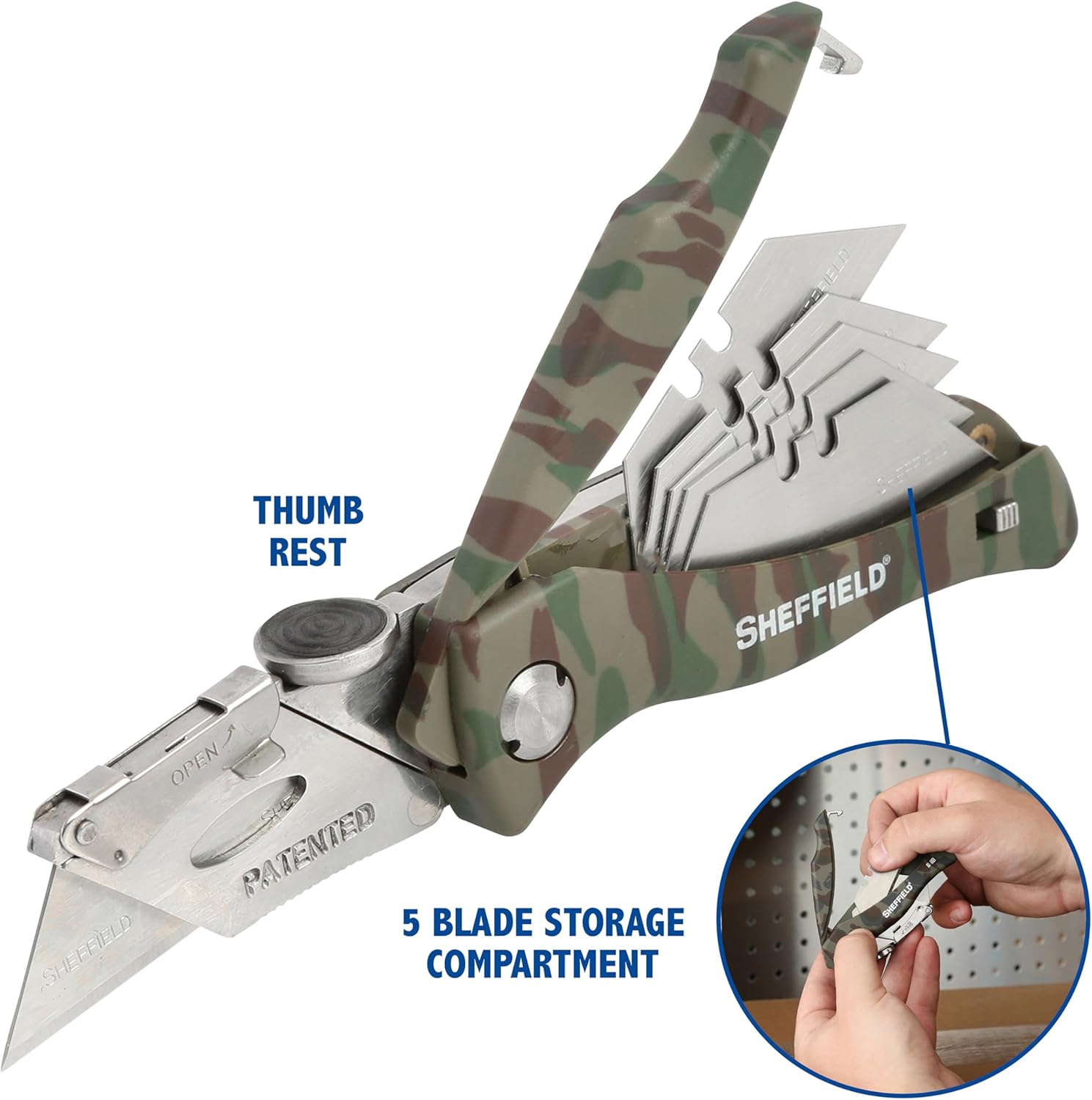 Product Description Sheffield Camouflage Quick Change Utility Knife, Camouflage Lightweight ABS Handle With Clip, Quick Change Mechanism, One Hand Opening Operation, Back Lock, 5 Extra Blades In Handle, Thumb Rest. From the Manufacturer Founded in 1919, Great Neck Saw Manufacturer has been manufacturing and marketing hand tools for over 80 years to professionals and DIY-ers worldwide. Great Neck is committed to providing the finest quality products at a competitive price. Camouflage lightweight ABS handle with pocket clip. Quick change mechanism One hand opening operation Back lock, thumb rest 5 Extra blades in handle.