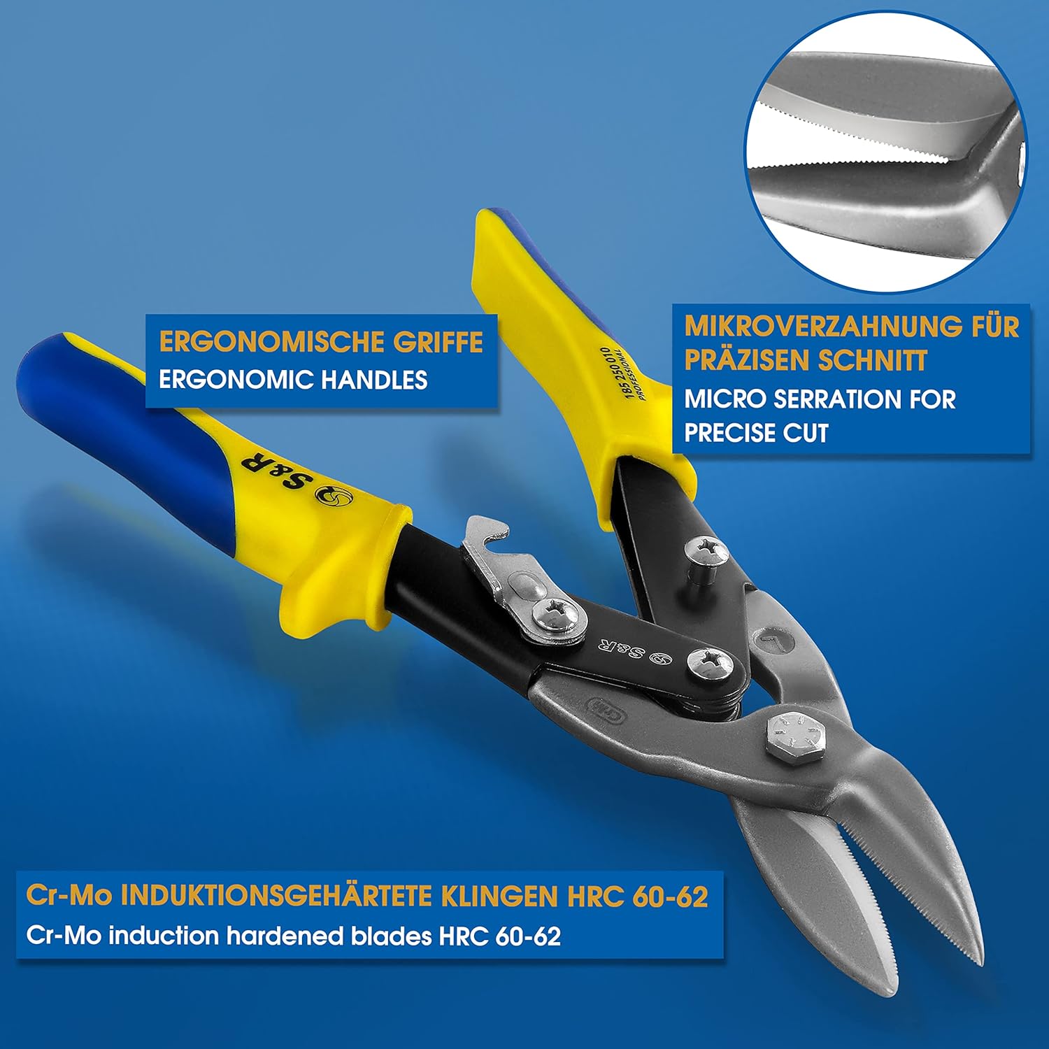 S&R Aviation Snip 250mm for professional continuous operationHigh quality tools for metalworkingApplication of Shearing: Cutting of sheet metal and profile metal , Cu 1.50 mm; Steel 1.20mm, 0.70mm InoxMaterial: Cr-Mo steelSpecial construction: working hardness 60-62 HRC, Left ;