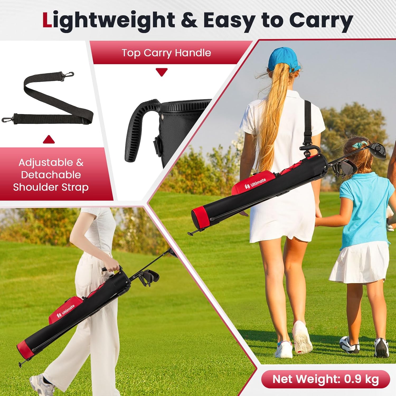 Description:Enjoy a more relaxed golf day with everything you need right by your side with this golf stand bag. Featuring a 2-way top divider, this golf stand bag allows for streamlined organization and protection of your clubs. It also includes a handy zippered pocket and a corded bottle holder to ensure you stay fully equipped and hydrated on the course. Equipped with a built-in carry handle and an adjustable shoulder strap, this lightweight Sunday golf bag can be transported from hole to hole effortlessly. Moreover, the innovative press-to-stand mechanism with quick-release brackets offers quick setup and added stability.Features:2-way divider top for efficient club organization and easy access Top handle and adjustable shoulder strap make it easy to carryLightweight and compact design for quick rounds or short trips A zippered pocket for storing golf essentials or personal itemsConvenient bottle holder meets your hydration needs Press-to-stand mechanism for easy and secure setupSturdy legs with Anti-slip foot pads enhance stabilitySpecifications:Color: Blue+Black / Blue+White / Pink+Black / Red+Black / Grey+Black Material: Polyester, Plastic Product Dimensions: 12.7 x 10.16 x 85 cm (L x W x H) Weight: 0.91 kg