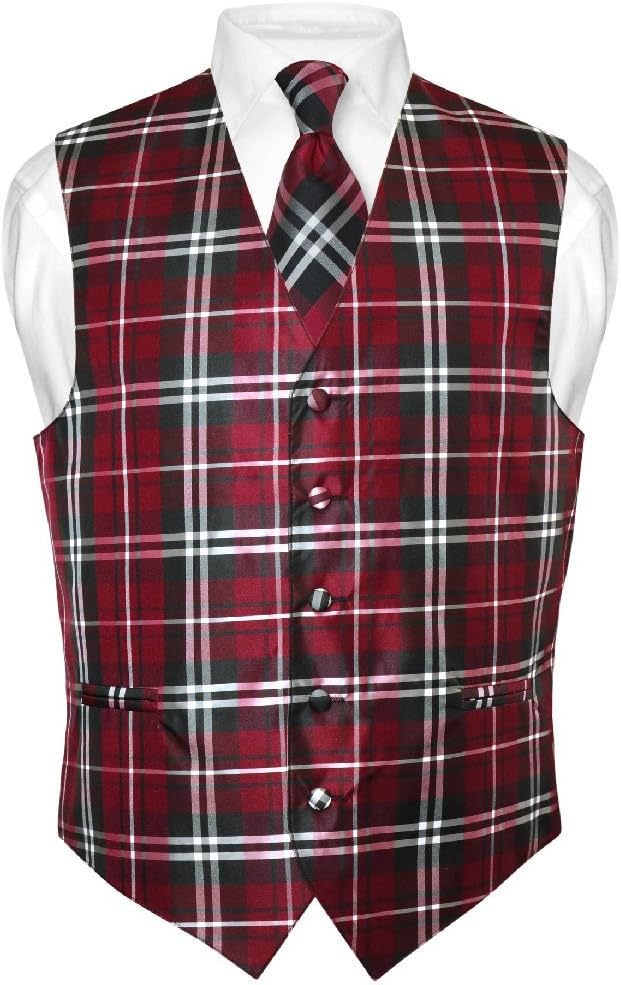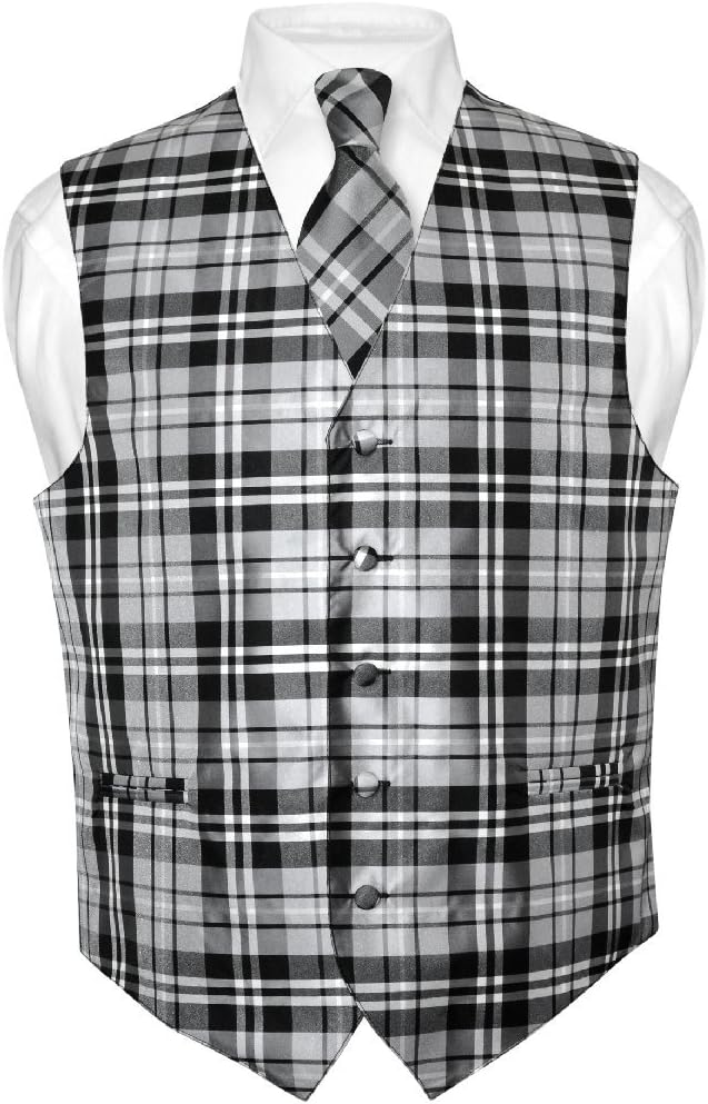 Brand New Vesuvio Napoli Brand Plaid Vest and NeckTie Set. Men's Black, Grey, and White Design Dress Plaids Vest with Neck Tie of the Same Pattern and Color and Made From The Same Material For a Perfect Match.This vest is Available in our listings in the following sizes: XS (Chest Size: 36), S (Chest Size: 38), M (Chest Size: 40), L (Chest Size: 42) , XL (Chest Size: 44), 2XL (Chest Size: 47), 3XL (Chest Size: 50), 4XL (Chest Size: 53), 5XL (Chest Size: 58), and 6XL (Chest Size: 62). Please Checkout Our Other Listings For More Plaid Design Colors and Sizes of Dress Vests and Neckties.