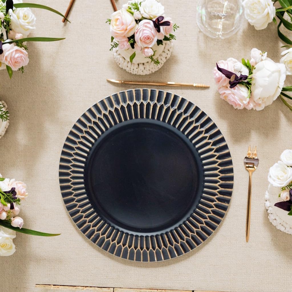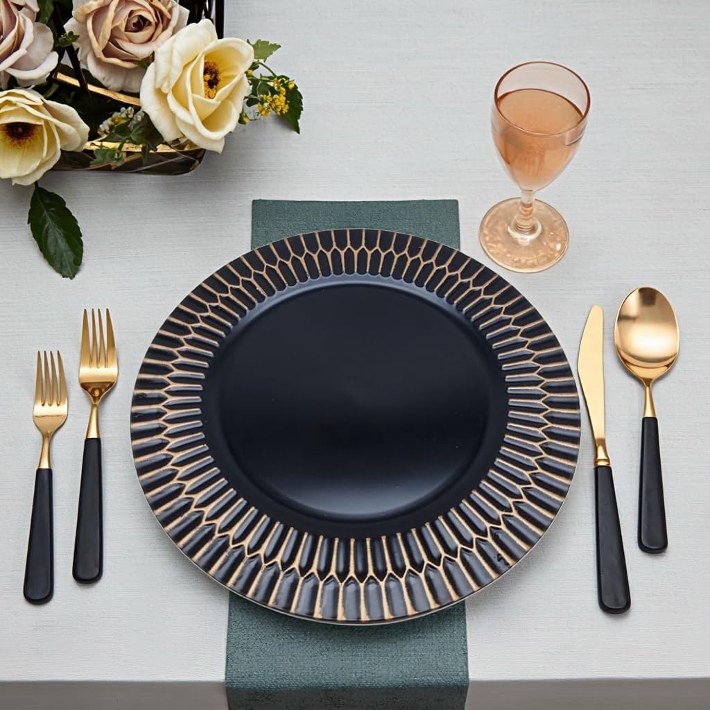 Enhance your home decor taste with this stylish black decorative plate, adorned with exquisite golden geometric patterns. The strong contrast between the matte black surface and the metallic gold details exudes a modern sense of luxury, making it a standout item in restaurants, living areas, or display cabinets. Made of high-quality PP material, this plate is sturdy and durable, and can maintain an elegant appearance for a long time. Its unique textured edges and smooth central surface combine visual interest and delicacy. Whether as a cushion for high-end dining, a base for displaying candles or small sculptures, or as an independent artistic ornament, it can easily enhance the beauty of any space. The surface of the plate is easy to maintain, just gently wipe it with a soft cloth to keep it tidy. For those who enjoy a blend of modern design and luxury, this decorative plate is the perfect choice for both daily decoration and special occasions.